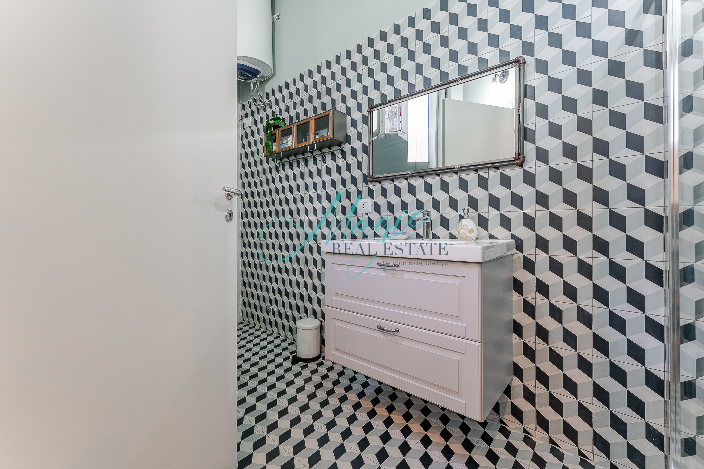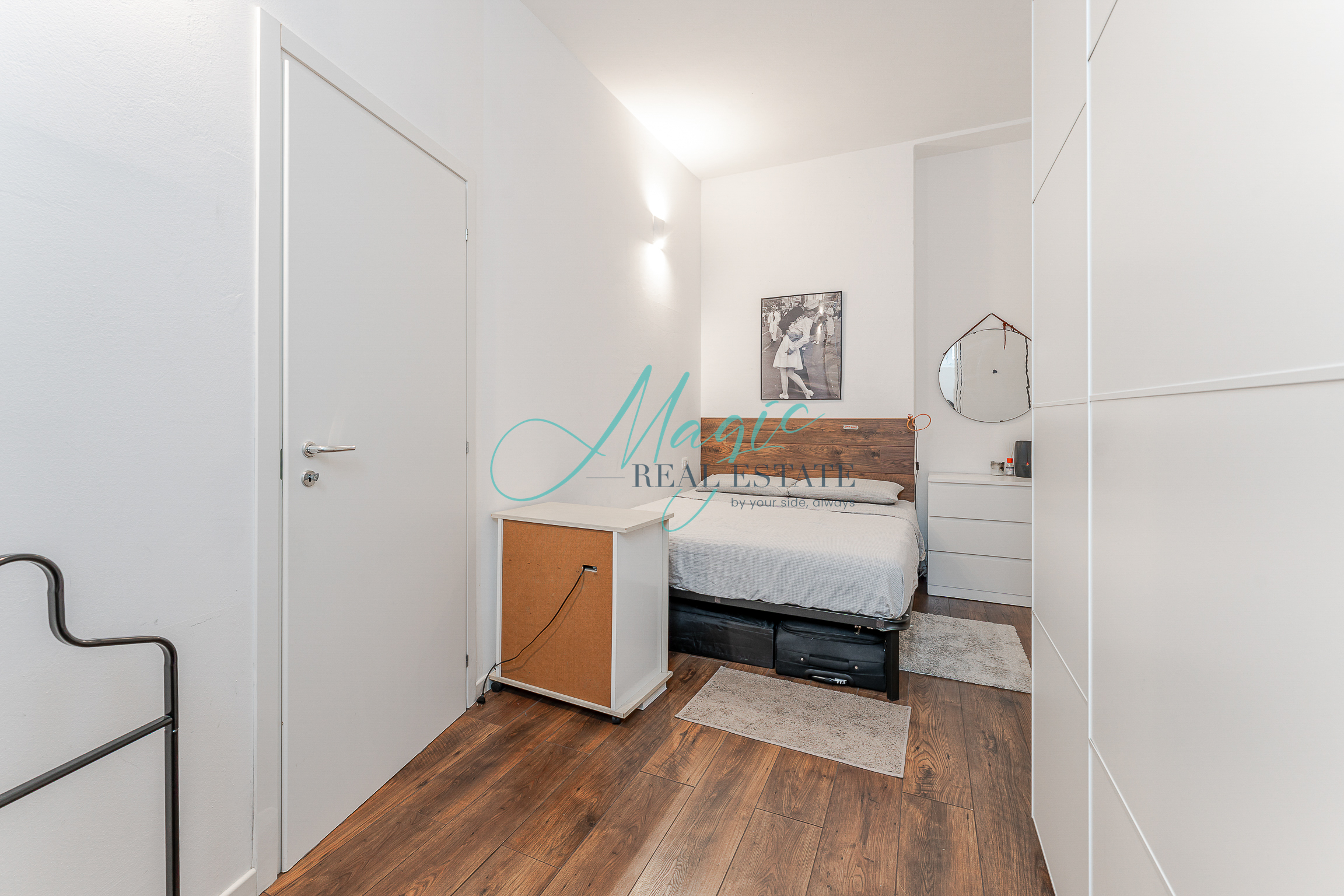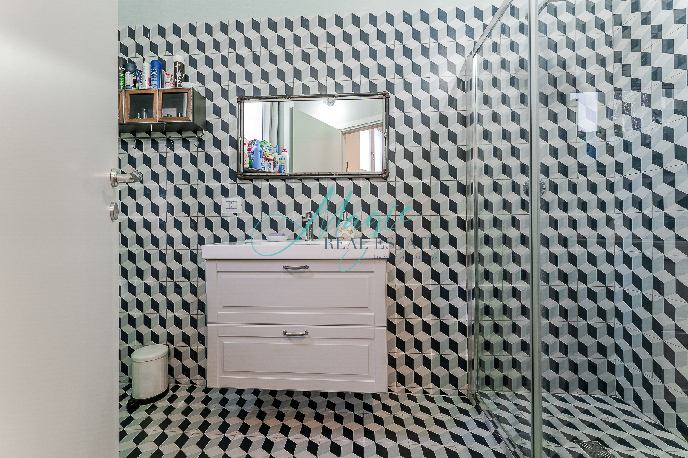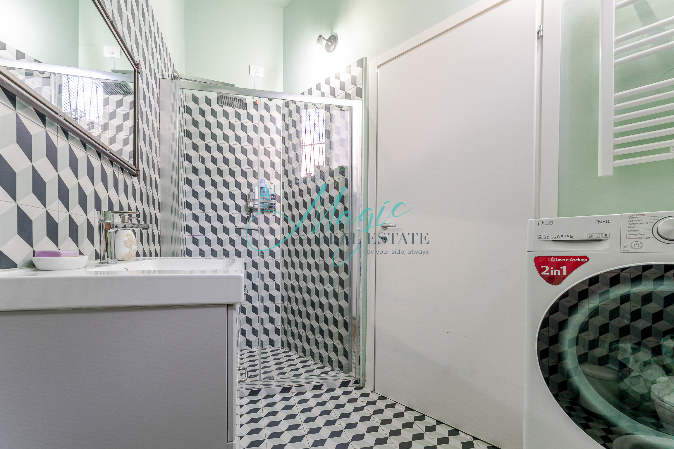 La zona notte, separata e silenziosa, offre tutto il comfort necessario, mentre il bagno ristrutturato conquista con il suo design originale, fatto di rivestimenti geometrici e una pratica doccia walk-in. Gli infissi in doppio vetro garantiscono tranquillità e isolamento, mentre il parquet dona calore agli ambienti.