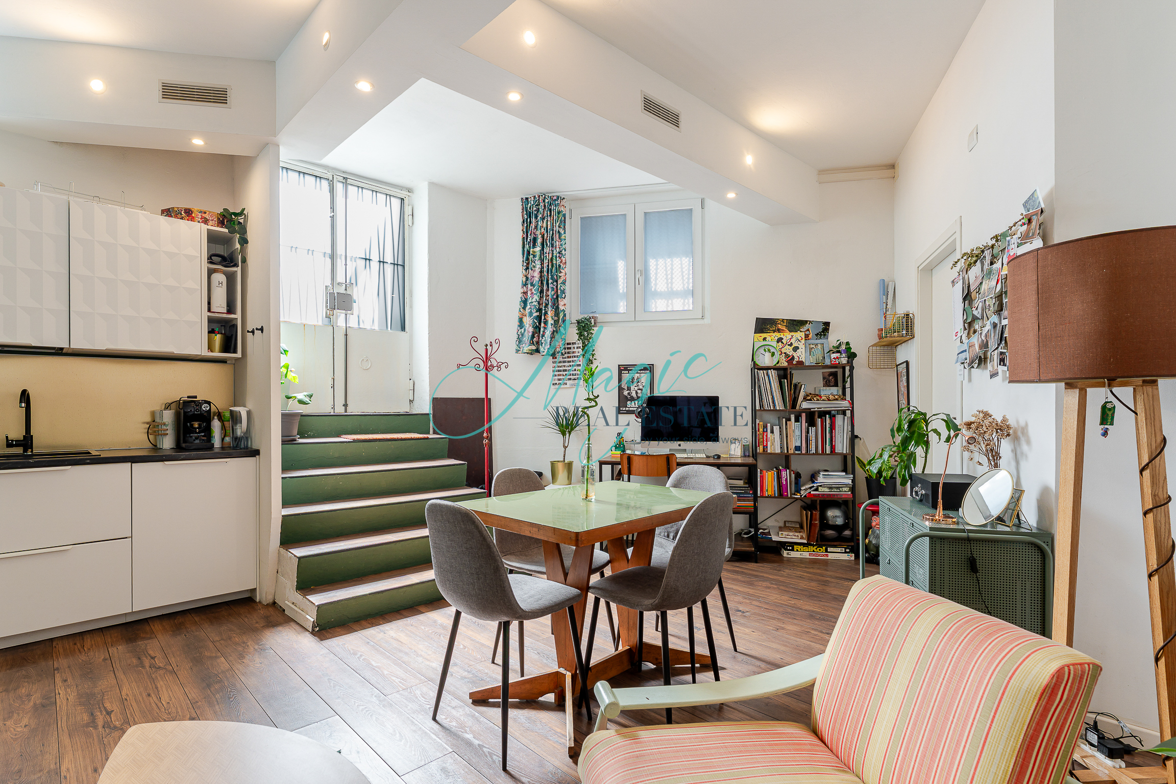 Situato in Via Stresa 29, questo appartamento di circa 56 mq si trova al piano seminterrato di un condominio in buone condizioni, e si distingue per la sua atmosfera creativa e