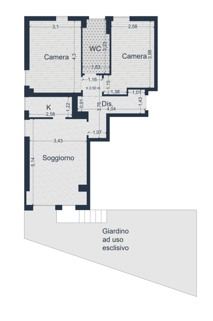 L’appartamento, con tripla esposizione, si compone di ingresso su corridoio che disimpegna gli ambienti, ampio soggiorno con cucinotto adiacente e uscita su un giardino privato di circa 60 mq ad uso esclusivo, ideale per momenti di relax all’aperto. La zona notte comprende due comode camere da letto e un bagno finestrato. Completa la proprietà una cantina di pertinenza. Internamente l’immobile si presenta in buono stato e offre possibilità di personalizzazione.