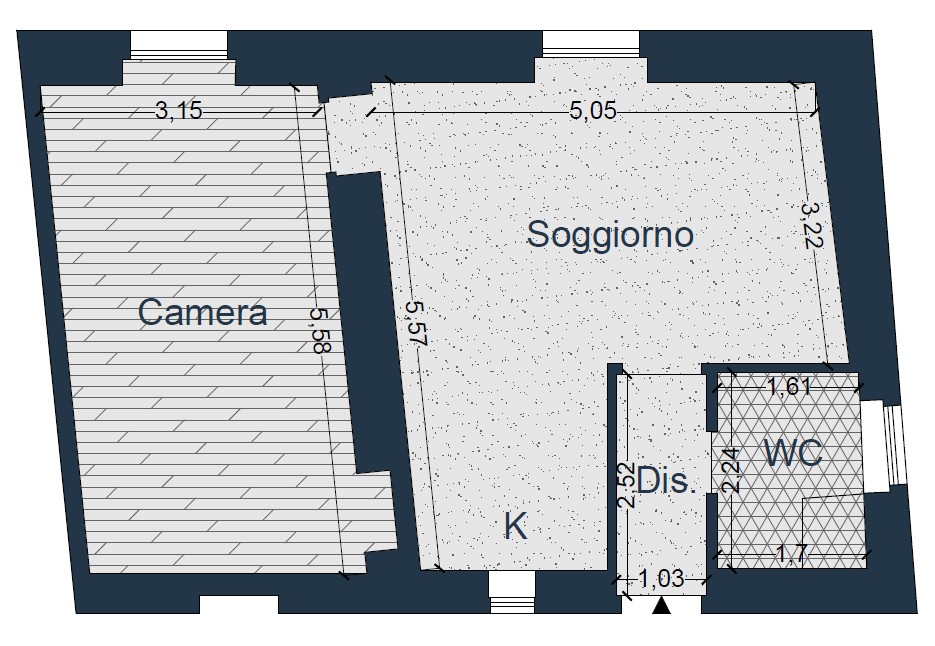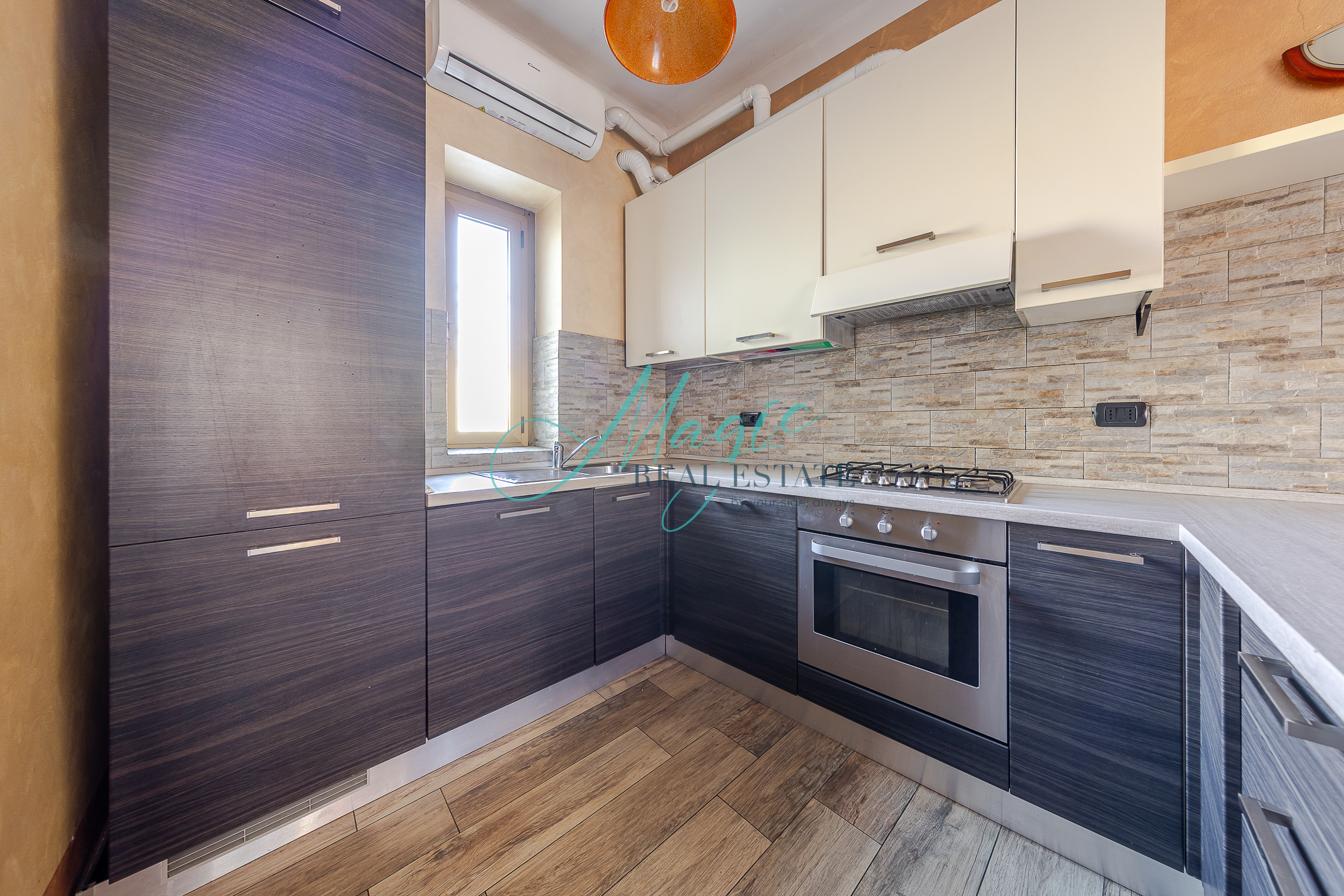 L’appartamento presenta una disposizione degli ambienti funzionale ed accogliente: la zona giorno è composta da un soggiorno con cucina a vista, caratterizzato da una doppia esposizione che garantisce ariosità e luce naturale durante tutto il giorno. La camera matrimoniale è spaziosa e ben distribuita, mentre il bagno, finestrato, è stato ristrutturato con finiture moderne.