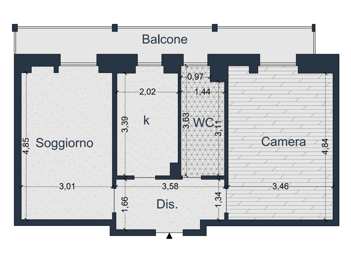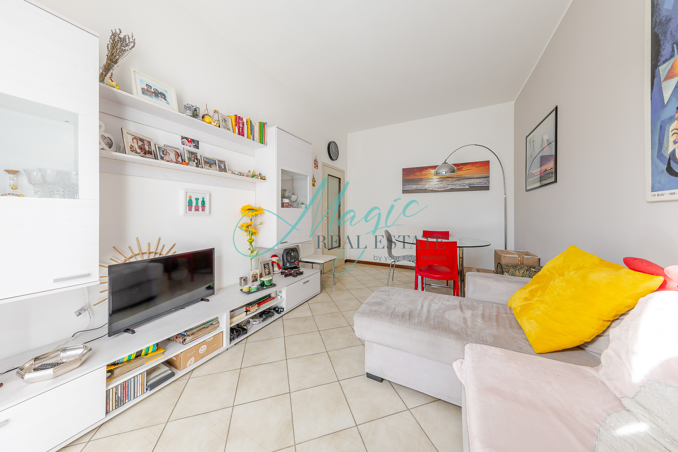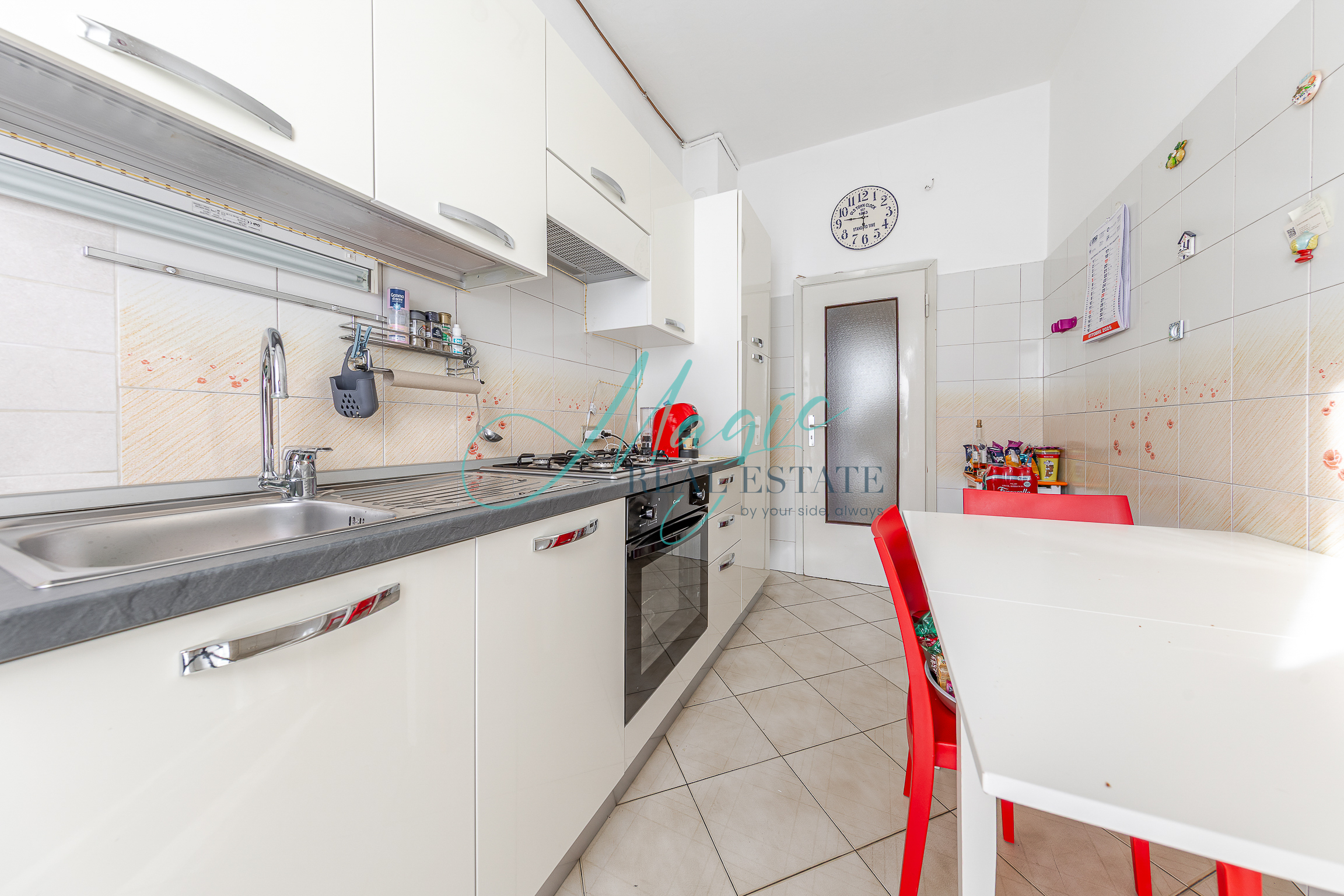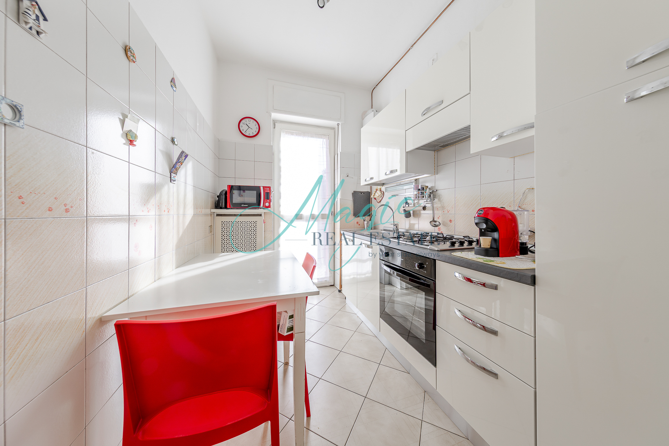 L’immobile presenta un ingresso su disimpegno che ci porta nella comoda zona living con uscita sul balcone, sulla destra troviamo la cucina separata sapientemente arredata e ben disposta.