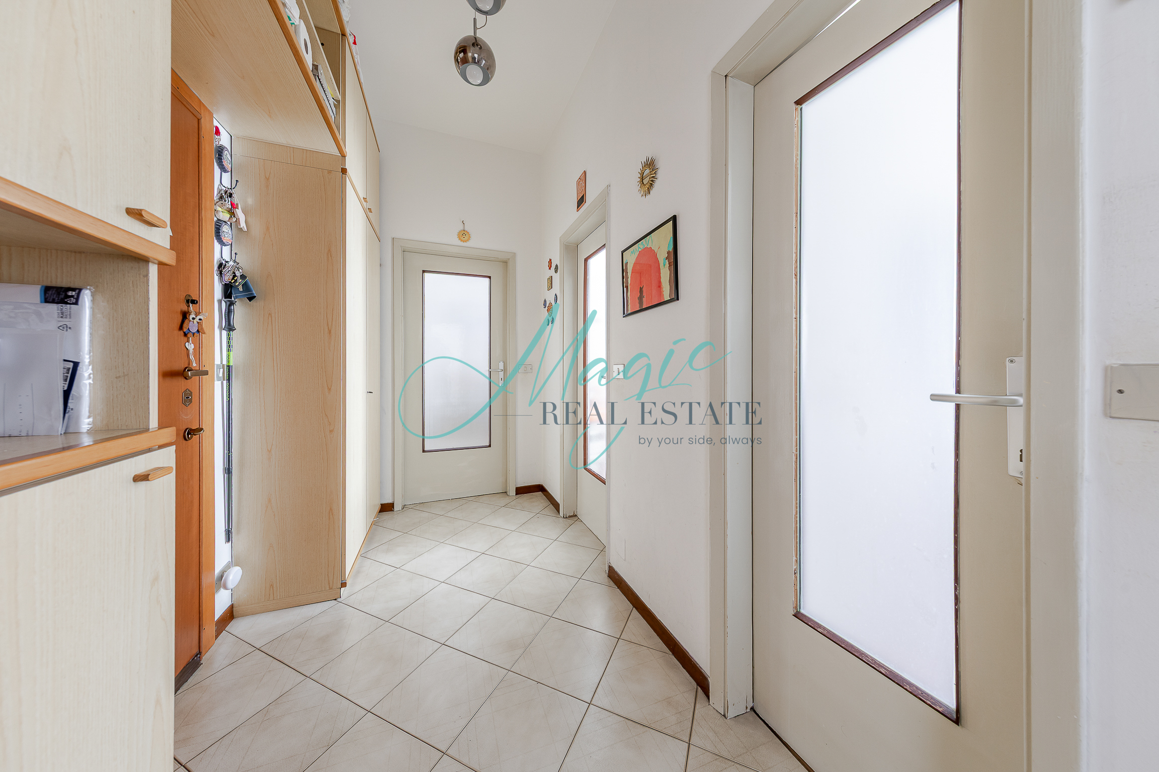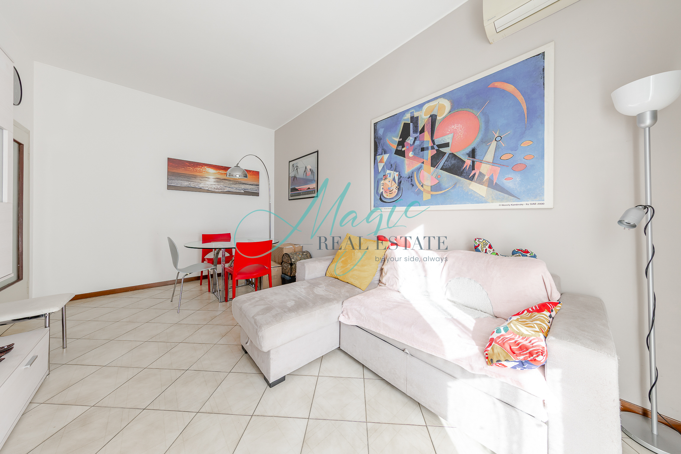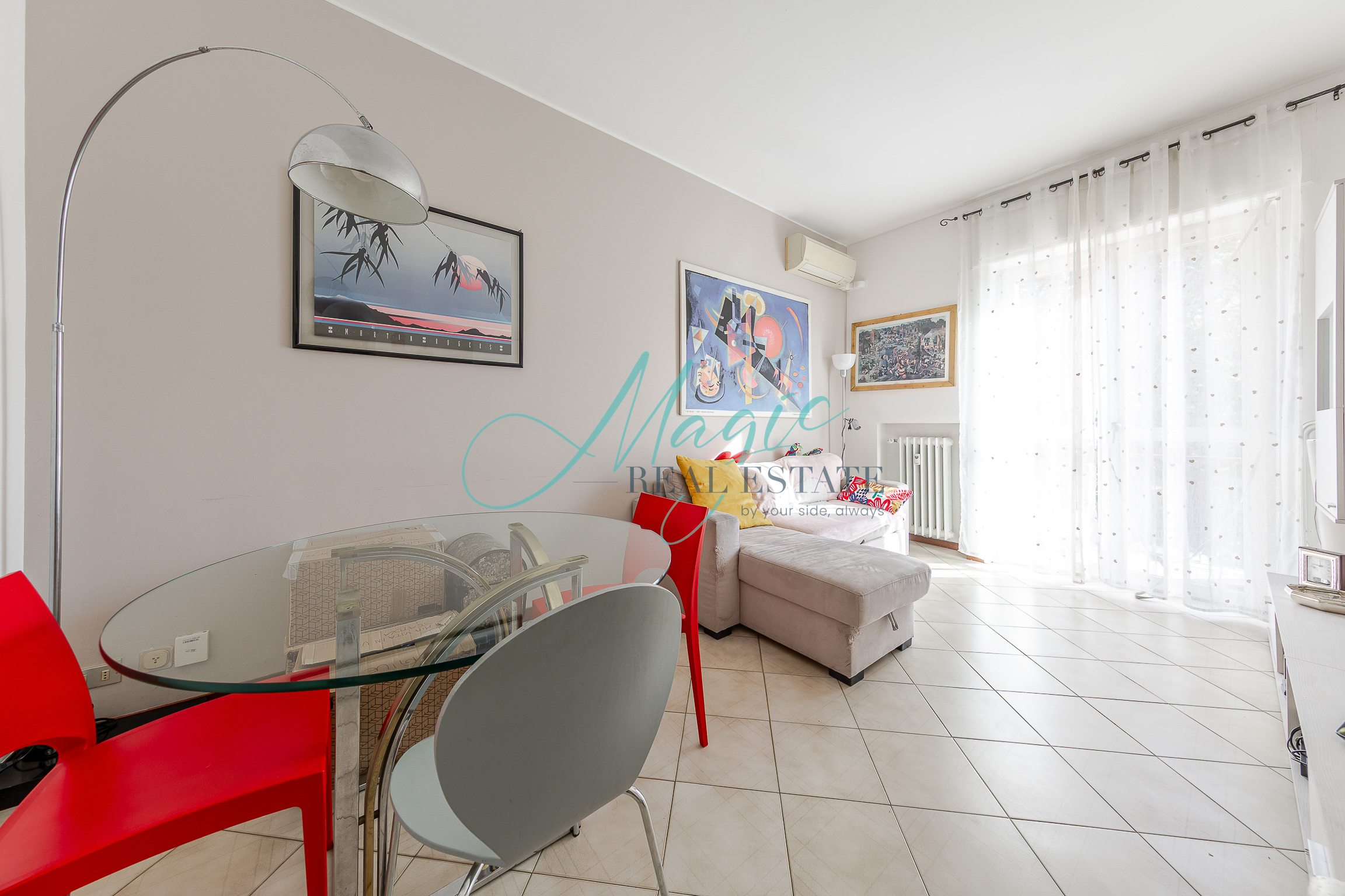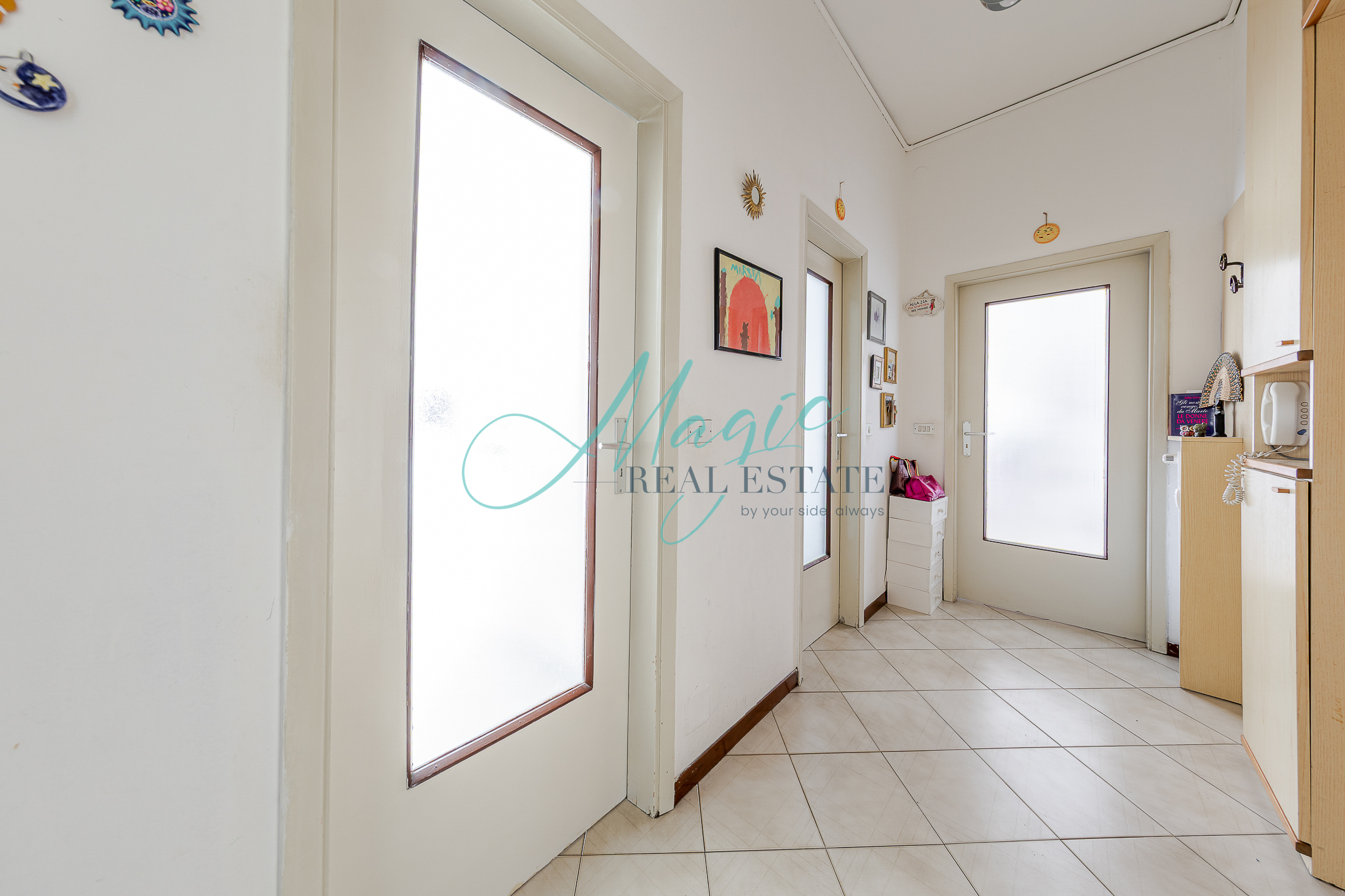 L’immobile presenta un ingresso su disimpegno che ci porta nella comoda zona living con uscita sul balcone, sulla destra troviamo la cucina separata sapientemente arredata e ben disposta.