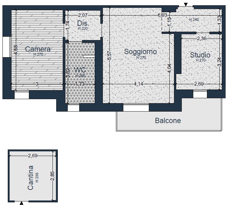 L’ingresso e’ caratterizzato da un disimpegno che ci porta direttamente nella zona living con cucina a vista e uscita sullo sfogo esterno, sulla destra troviamo un ampio bagno finestrato e la camera matrimoniale. Dalla parte opposta della casa possiamo trovare la zona studio/cameretta sempre con la medesima esposizione.