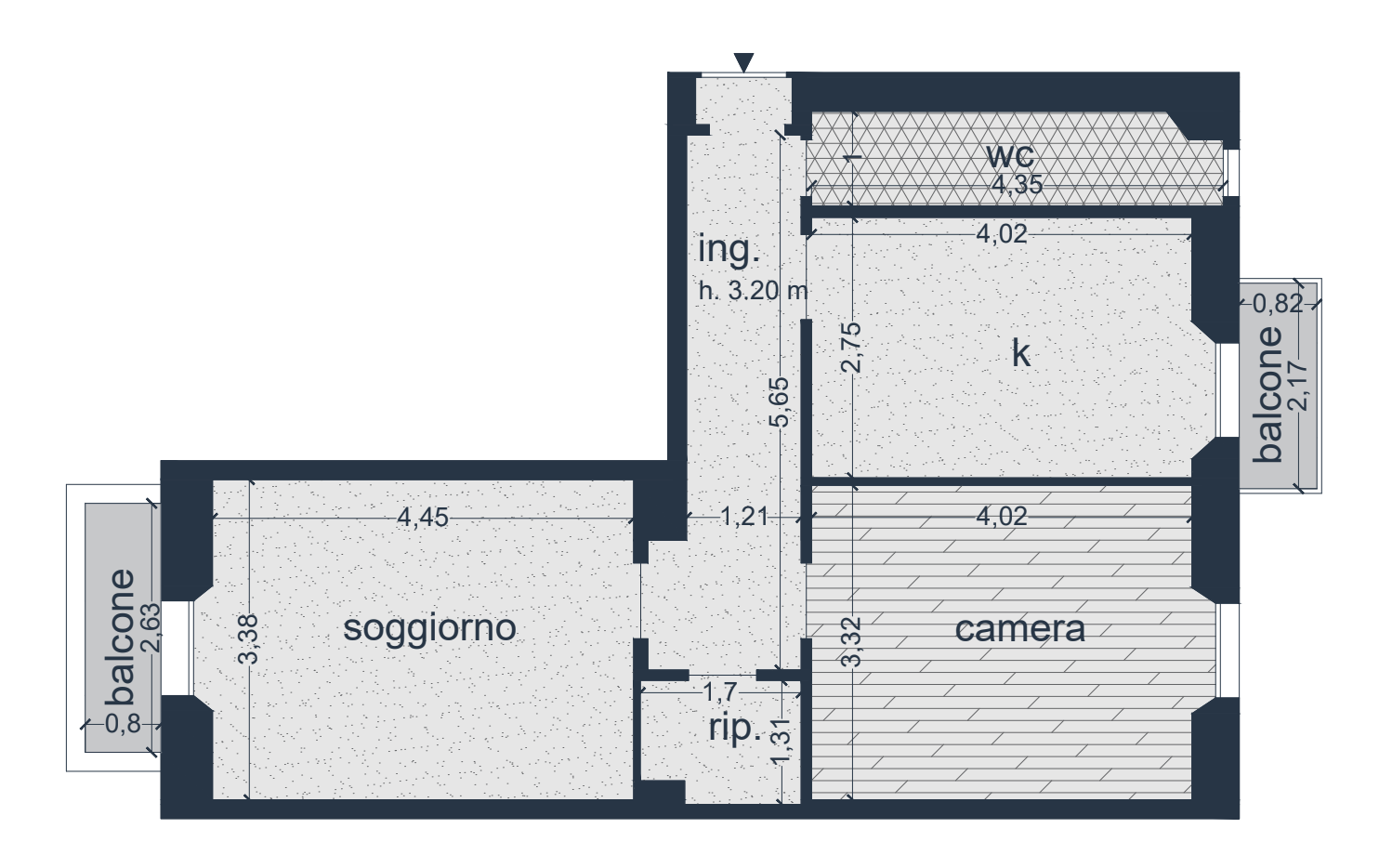 L’immobile si compone di ingresso, soggiorno, cucina abitabile con accesso al primo balcone, camera matrimoniale, bagno finestrato, ripostiglio e secondo balcone. Completa la proprietà una cantina di pertinenza al piano seminterrato.